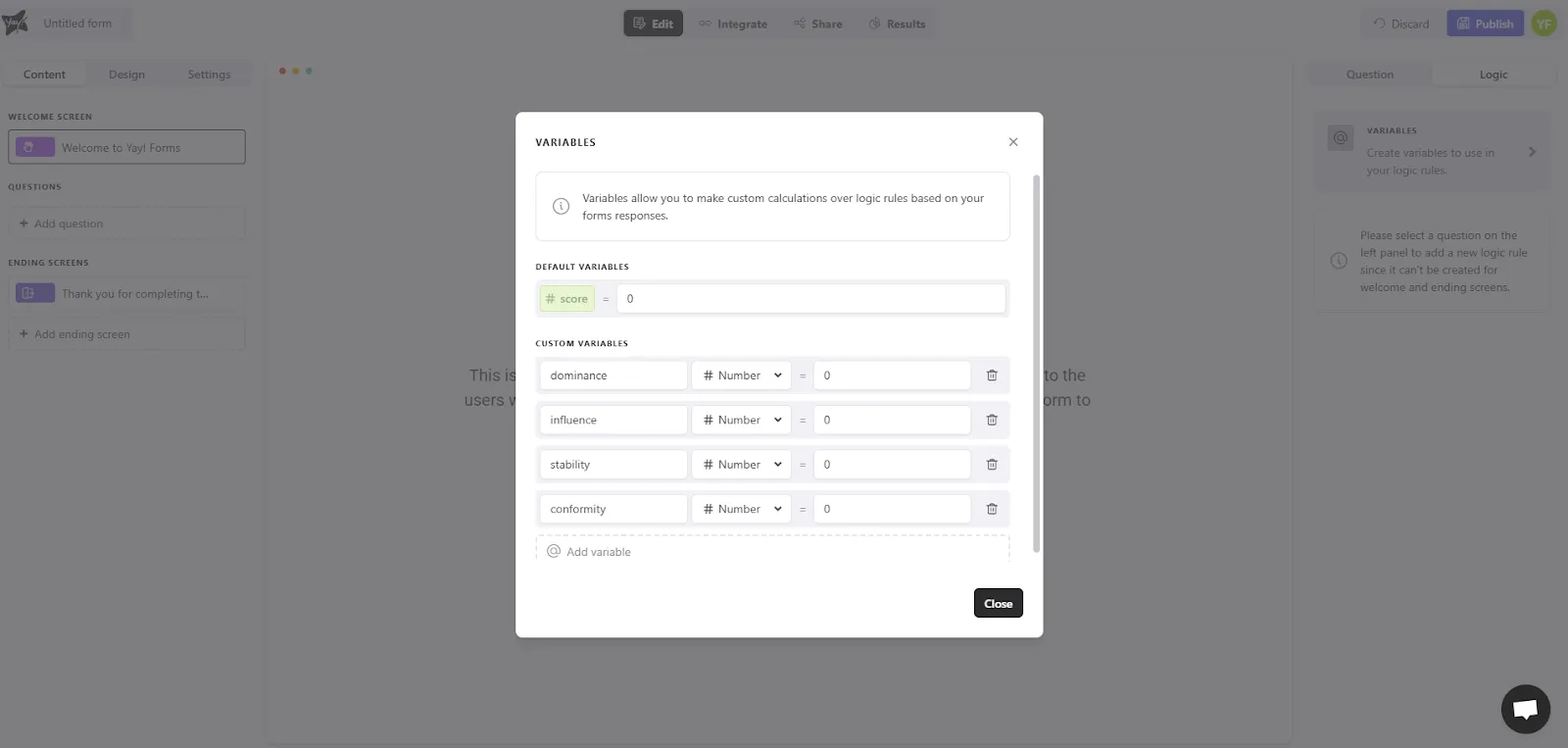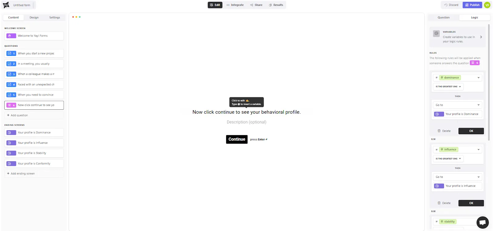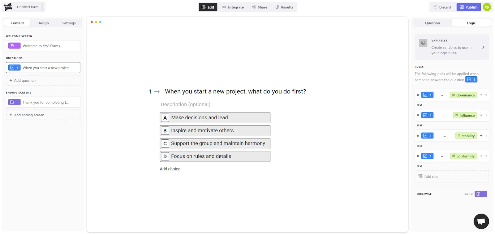 Below you’ll find an example that can serve as a basis for creating your own DISC personality quiz. In it, we show, for example, how points will be added to variables.